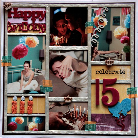 Finally I added the number 15 out of my stash to balance out the pink of the Happy Birthday on the opposite corner. Some washi tape to add a little more color and tie in more of the summery colors in the photos. I used some old paper i had in my stash.. Basic Grey...as my background. I painted up some timber crowns and added the sticker word celebrate.